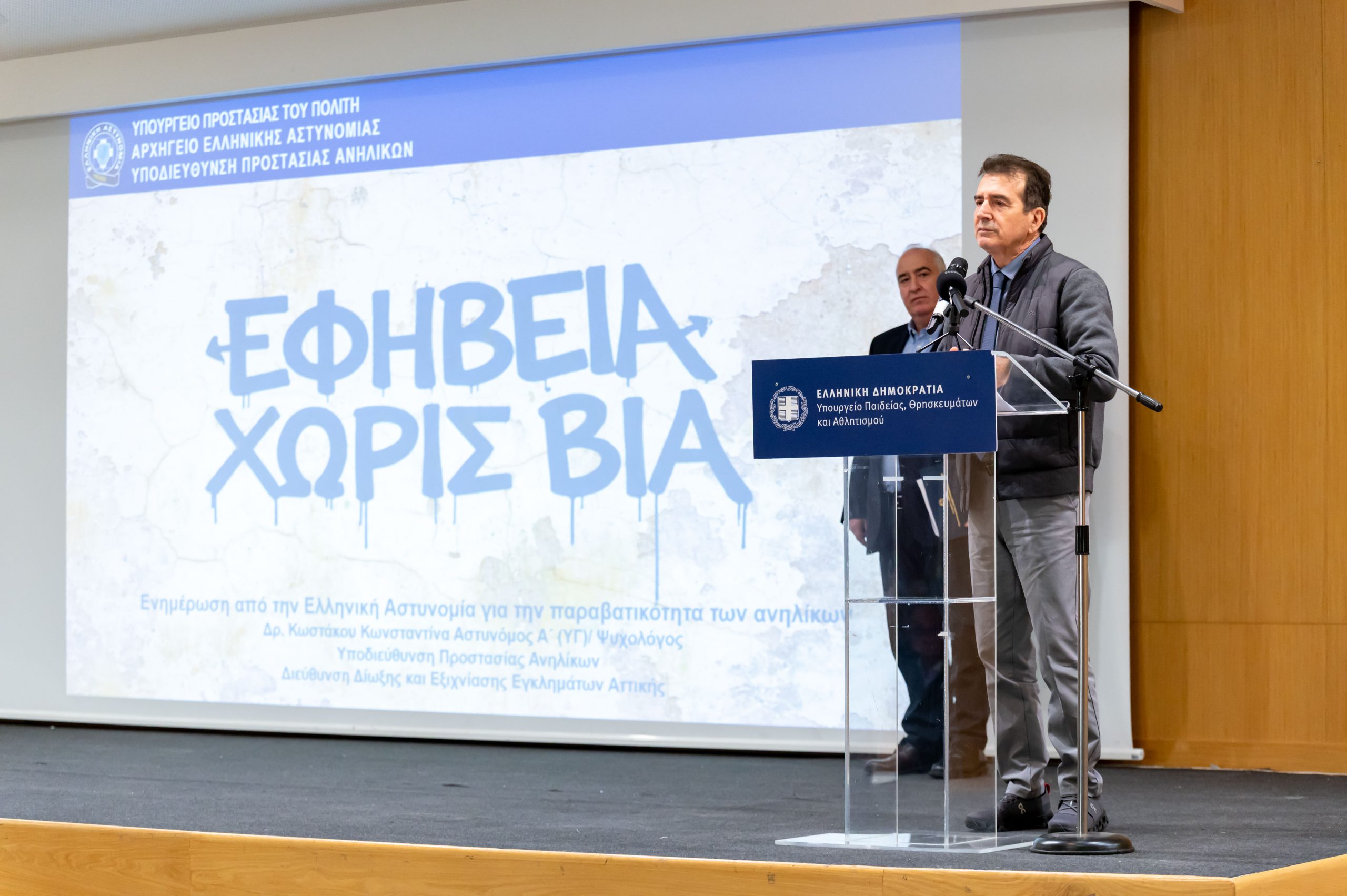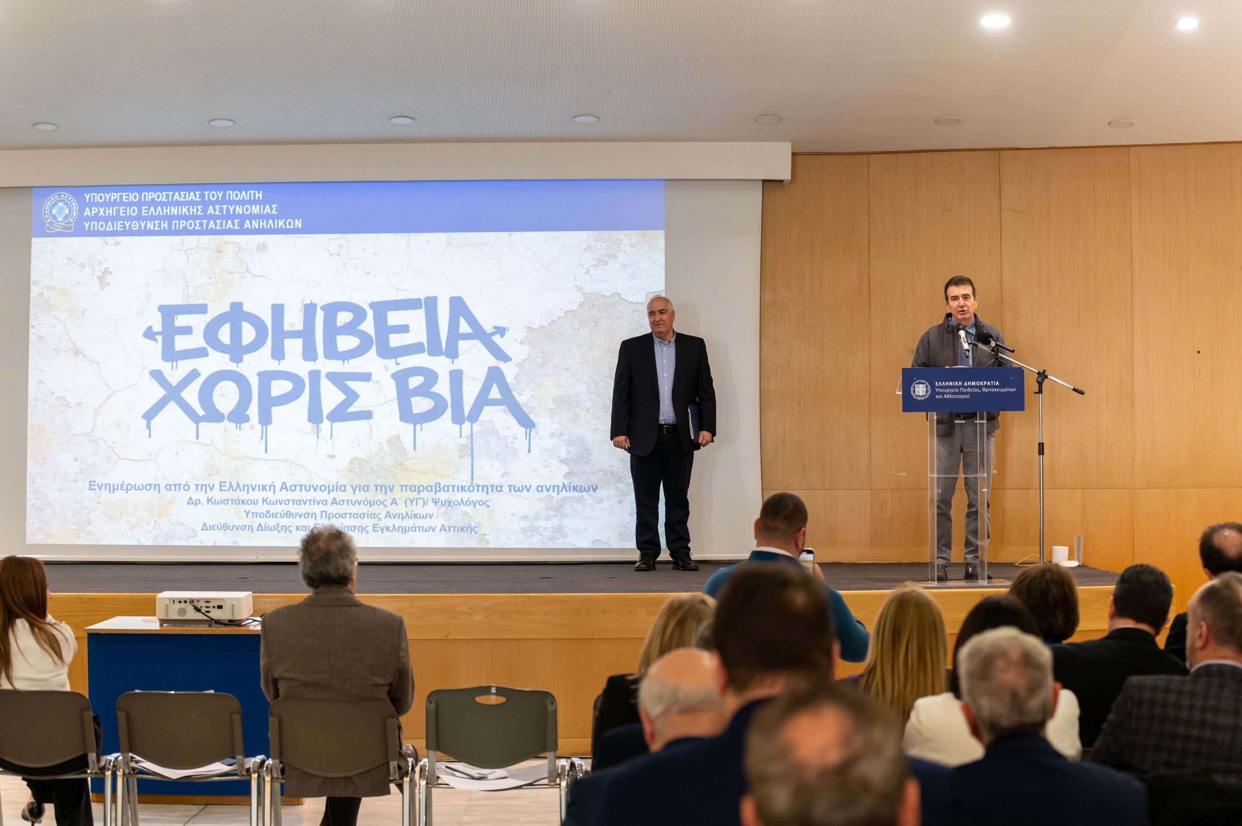 Ενημερωτική ημερίδα με θέμα: «Στρατηγικές Πρόληψης και Διαχείρισης Θεμάτων Κοινωνικής Συμπεριφοράς Μαθητών/τριών της Δευτεροβάθμιας Εκπαίδευσης», πραγματοποιήθηκε σήμερα, στο Υπουργείο Παιδείας, Θρησκευμάτων και Αθλητισμού, με πρωτοβουλία των Υπουργών, Παιδείας, Θρησκευμάτων & Αθλητισμού, Σοφίας Ζαχαράκη και Προστασίας του Πολίτη, Μιχάλη Χρυσοχοΐδη.